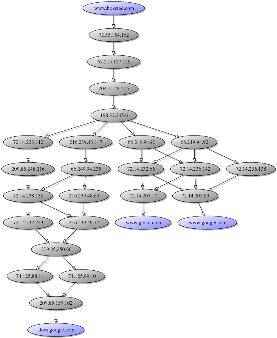 Here's an example of a traceroute from www.hokstad.com to www.gmail.com, docs.google.com and www.google.com (scaled down):